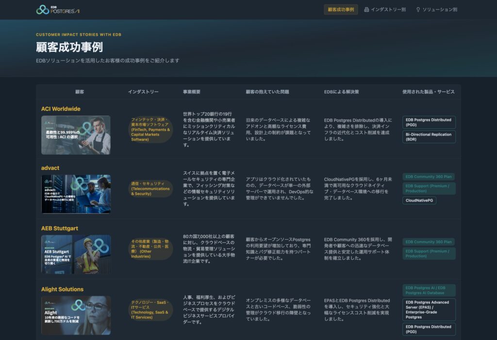 - ② 成功ストーリーへのダイレクトアクセス:各事例の概要から、詳細な解決策を記した顧客成功事例eBookや、活用されたEDB製品情報解説へ1クリックでアクセス。理論ではなく「実例」に基づいた検証が可能です。